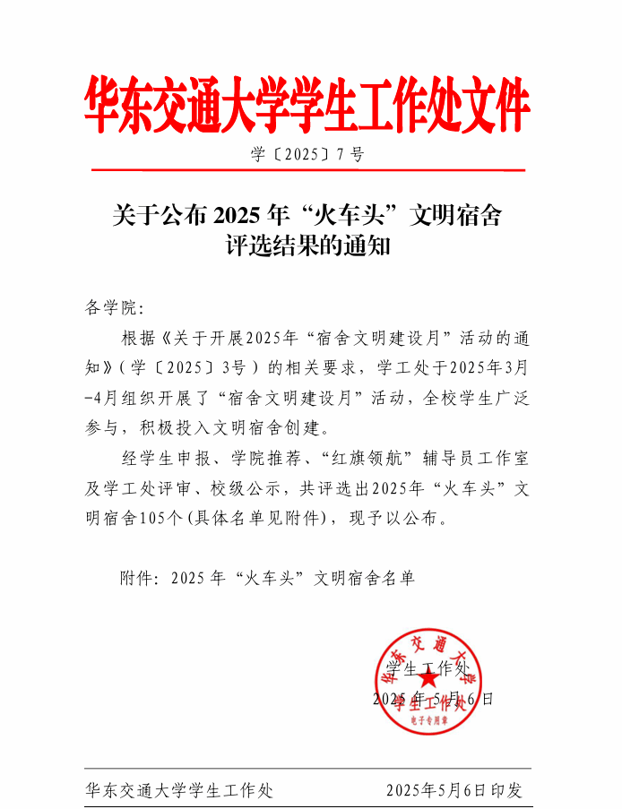 喜报|公司两个宿舍获评“火车头”文明宿舍