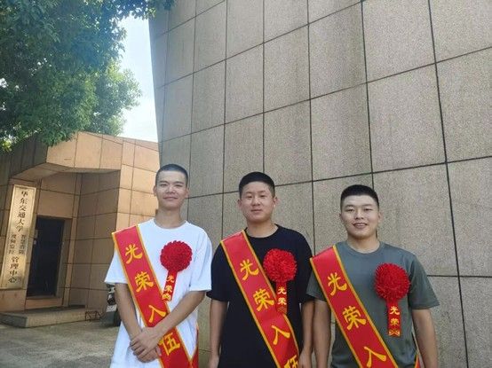 在校园里,他们专注于材料学科学习,面对征兵号召,他们挑起重担,用坚定的选择诠释“强国有我”的青年担当。临行之际,他们三人着装整齐,身姿挺拔,胸前的绶带格外醒目,尽显新时代青年的朝气与坚毅。告别时刻,三人与师生们合影留念,随后依次依次登上专车。