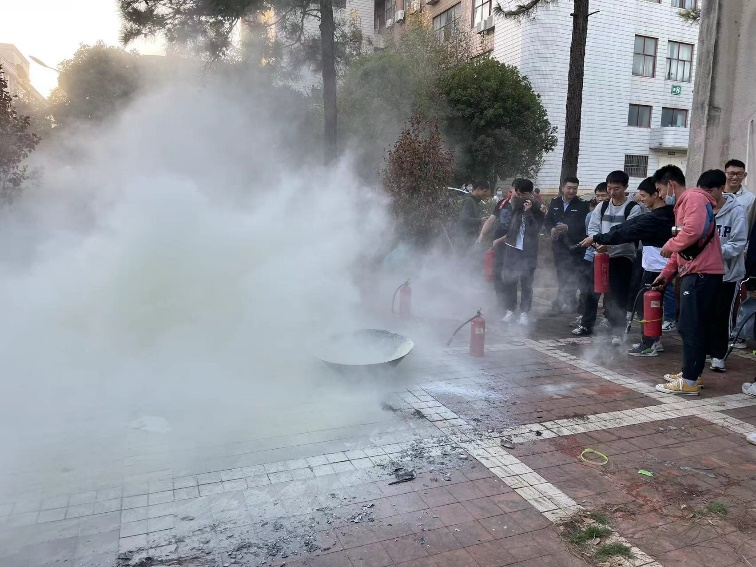 随后,张警官带领师生们进行实地消防演练,指导员工们如何正确使用干粉灭火器及水基型灭火器。
