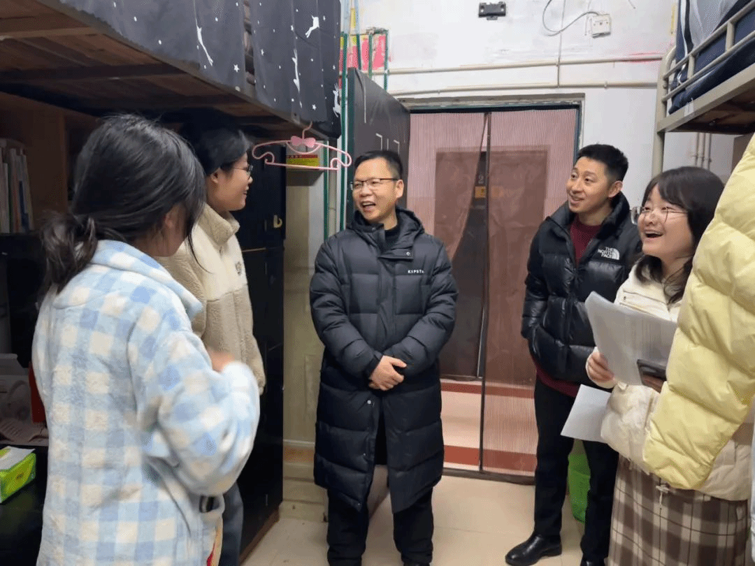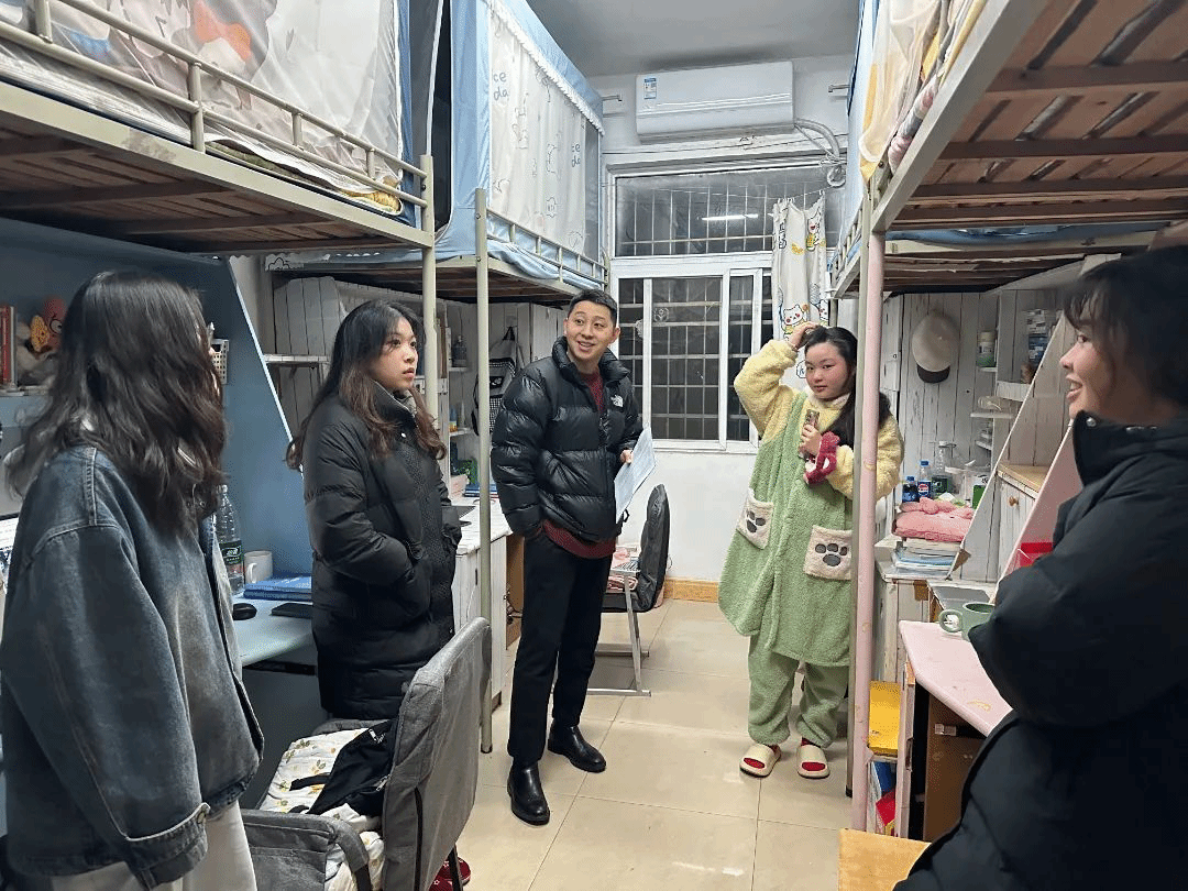 院领导深入员工宿舍与同学们亲切交流,仔细询问假期学习实践情况及返校适应状态,提醒同学们及时打扫卫生,通风消毒,规范物品摆放,保持环境整洁。特别强调宿舍安全,注意易燃物品,严禁使用大功率电器、不合格插排、私拉电线等危险行为。同学们也分享了自己在假期生活中的点滴趣事。