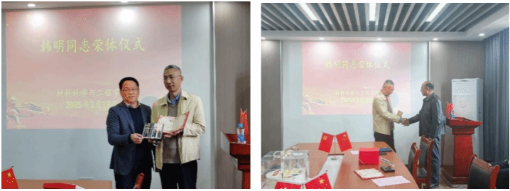 仪式伊始,公司领导及材控系主任分别致辞。经理沈明学教授深情回顾了韩明老师对公司的卓越贡献,称赞他“以严谨治学的态度、春风化雨的教学风范,培养了一代代优秀学子,为学科发展和公司建设做出了不可替代的贡献”。党委书记赵龙志教授动情表示:“韩老师不仅是员工的引路人,更是青年教师的榜样。他的敬业精神与人格魅力,深深镌刻在公司发展的里程碑上。”材控系主任焦海涛老师则细数韩老师扎根教学科研一线的点滴,感怀他“用热爱与坚守诠释了师者的初心”。