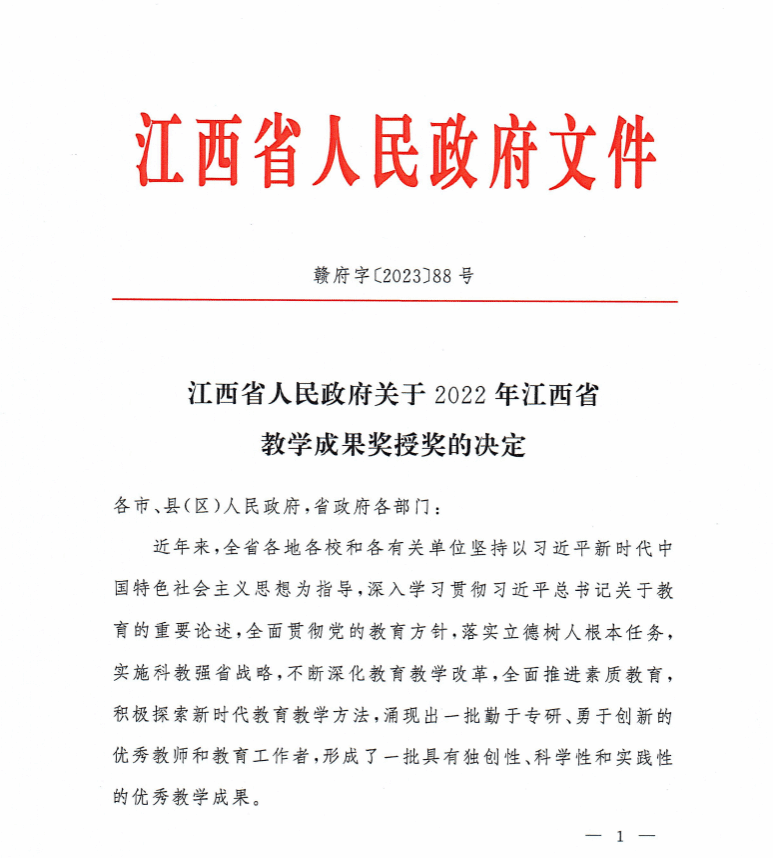2022年江西省教学成果奖,系我省首次开展的由省人民政府表彰的教学成果奖励项目,反映了江西省高校公司产品水平的重要标志。本次是公司继2019年主持获江西省教学成果奖二等奖以来获得的重大突破。这些成果的取得,充分体现了近年来公司在深入落实立德树人根本任务,不断加强专业综合改革,持续提升人才培养质量方面所取得的显著成效。