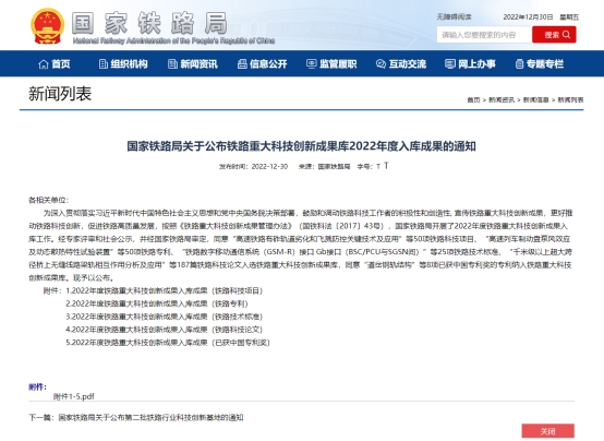 公司入选的2022年度铁路重大科技创新成果库一览表