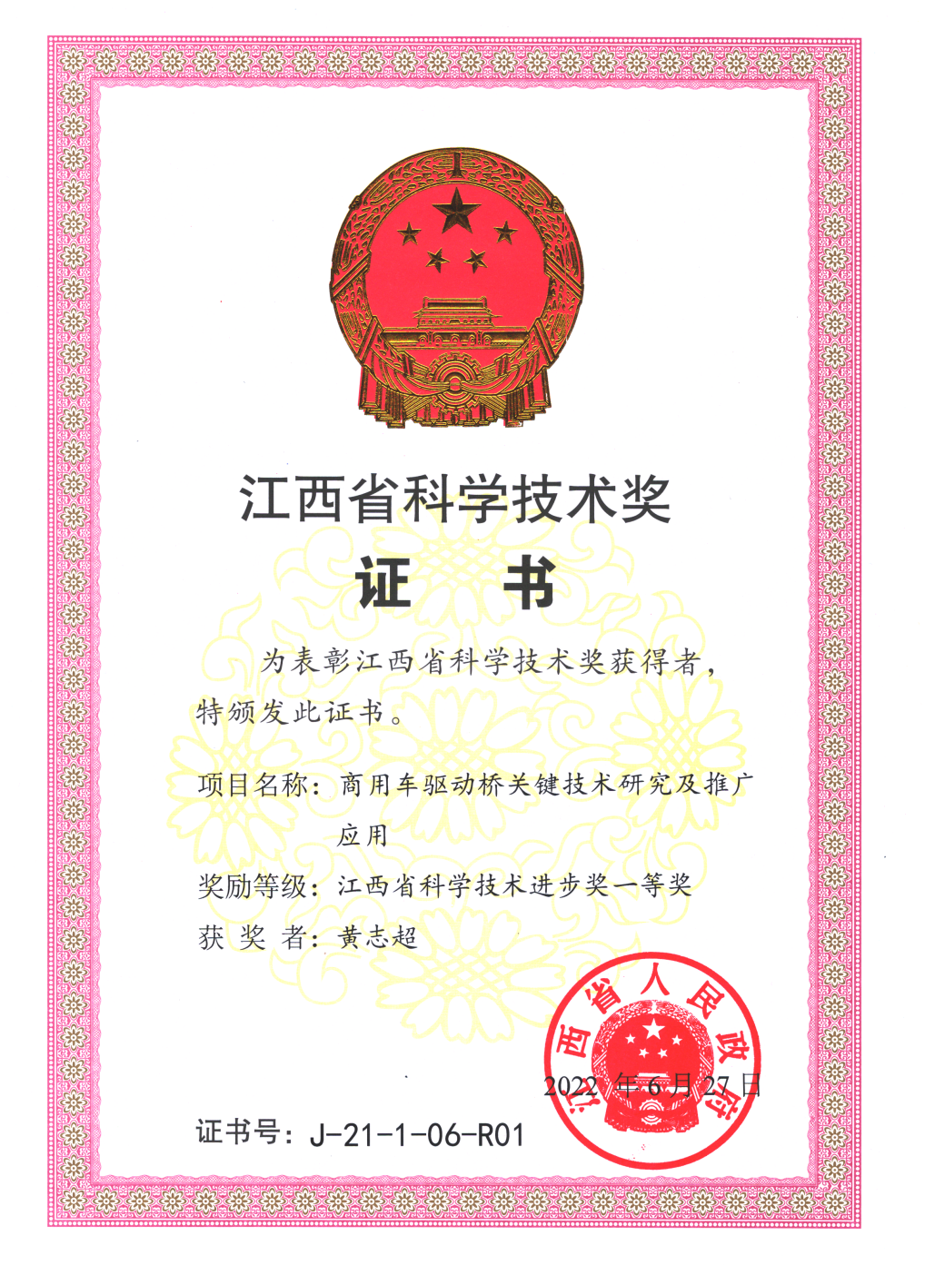 我院黄志超教授荣获江西省科技进步奖一等奖(项目名称:商用车驱动桥关键技术研究及推广应用)。