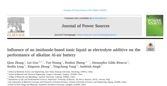 喜报:咪唑基离子液体作为电解质添加剂对碱性铝-空气电池性能研究取得新进展