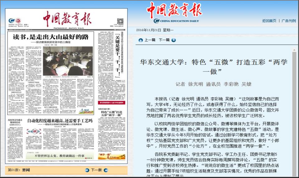 《中国教育报》头版报道公司以“五微”为载体,深入推进员工党员“两学一做”学习教育的主要做法和成效。
