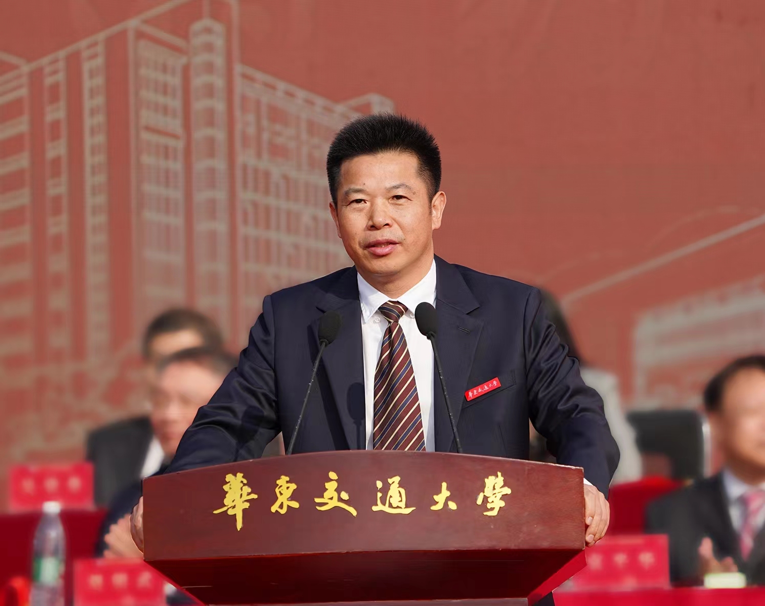 新生佩戴校徽宣誓仪式上,全体新生整装肃立,郑重地将校徽佩戴至左胸前,戴上这枚徽章,就接过了“铁”的接力棒,有了斩不断的“铁”之印记和磨不灭的“铁”之使命,开启了“铁”的新征程。“遵循‘日新其德、止于至善’的校训,争做新时代铁人铁军,力做有理想、敢担当、能吃苦、肯奋斗的新时代华交青年......”新生右手握拳,铮铮誓言激发着奋进的力量。